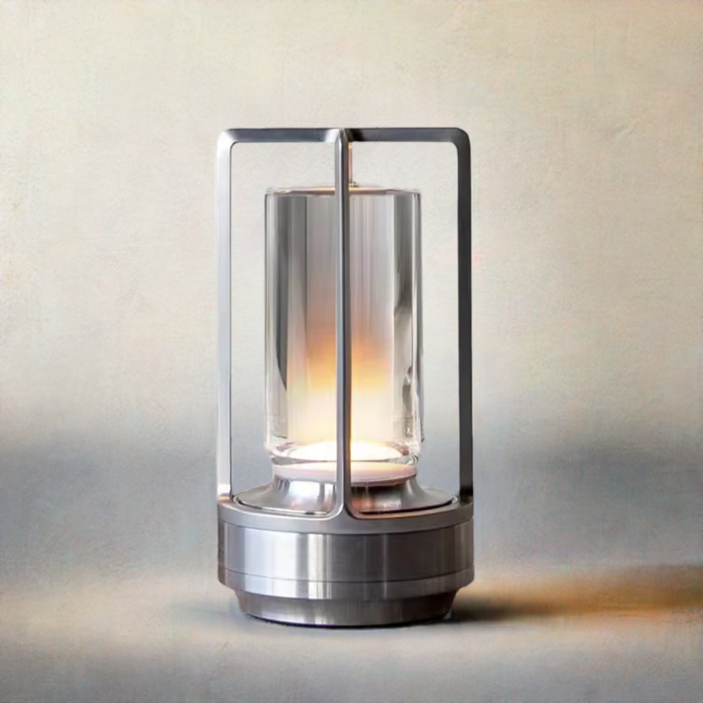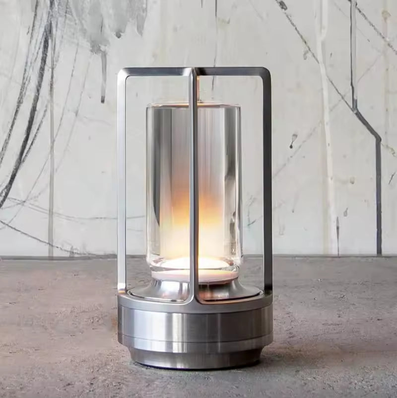 A modern interpretation of classic design features a sleek metal frame that encloses a glowing glass vessel, reminiscent of traditional lanterns. The adjustable light intensity allows you to create a warm and inviting atmosphere in any space. With its rechargeable battery and wireless design, this versatile lamp is perfect for bedrooms, living rooms, or outdoor settings.